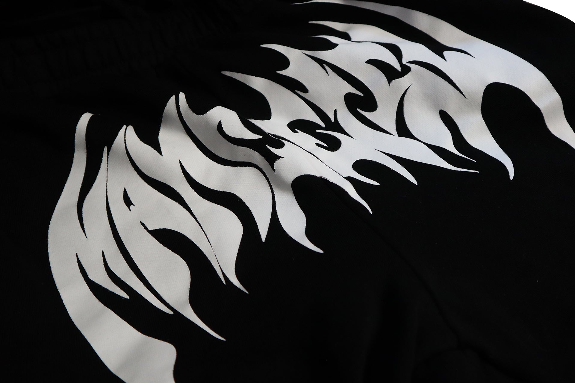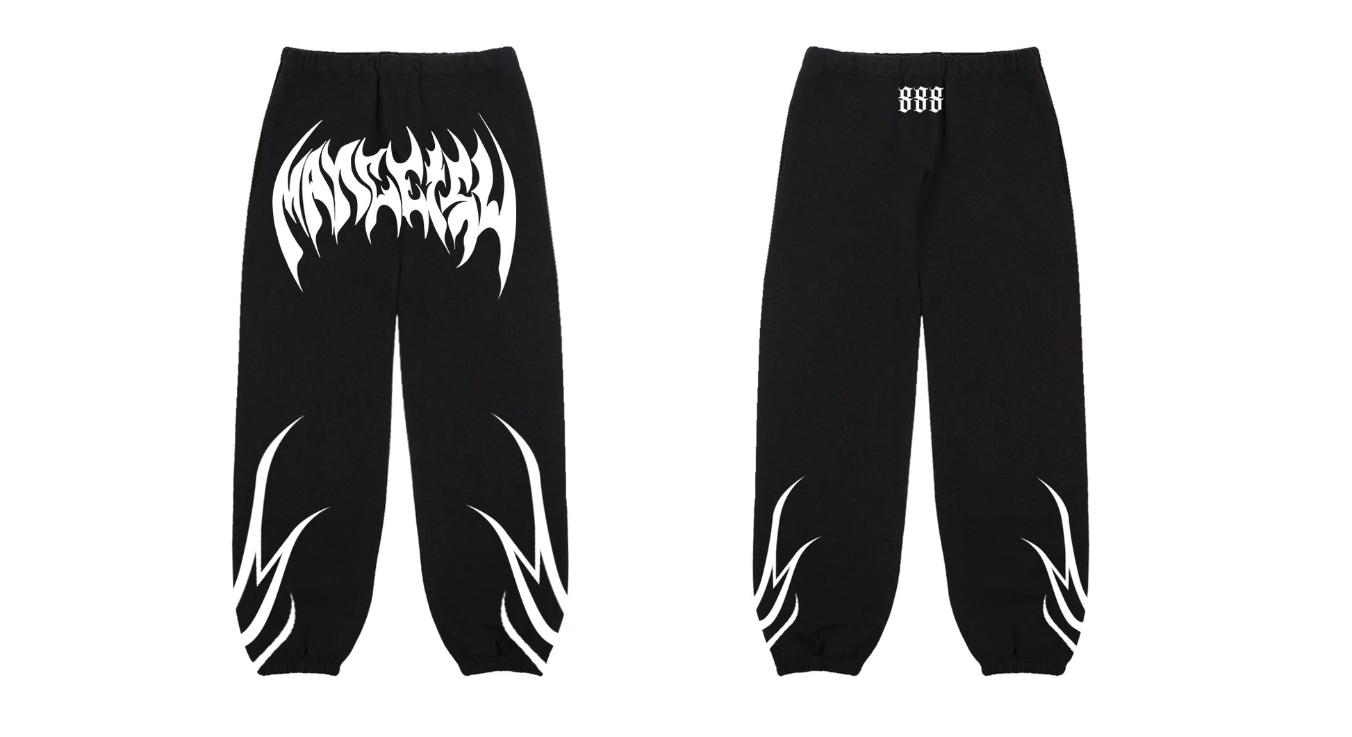 - Black joggers/sweatpants with large MANGETSU logo on crotch. Has 888 logo on back and also has white skeleton flames (yes i named it that) on front/back of legs.
